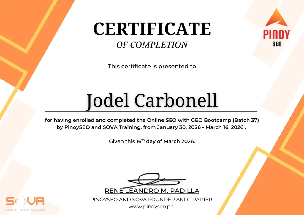 I completed the Pinoy SEO Bootcamp (January–March 2026), where I gained hands-on experience in keyword research, on-page SEO, technical SEO, and content optimization. This training strengthened my ability to help businesses improve their search rankings and online visibility.